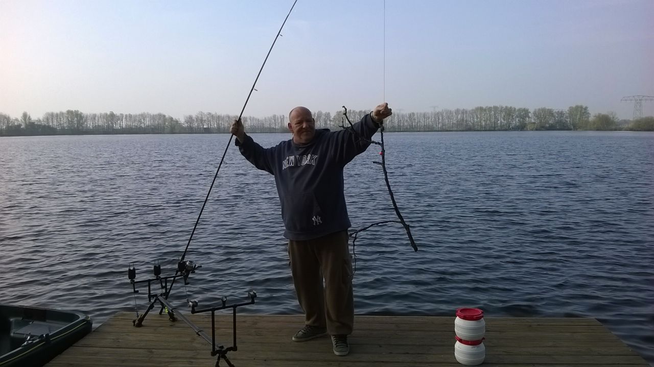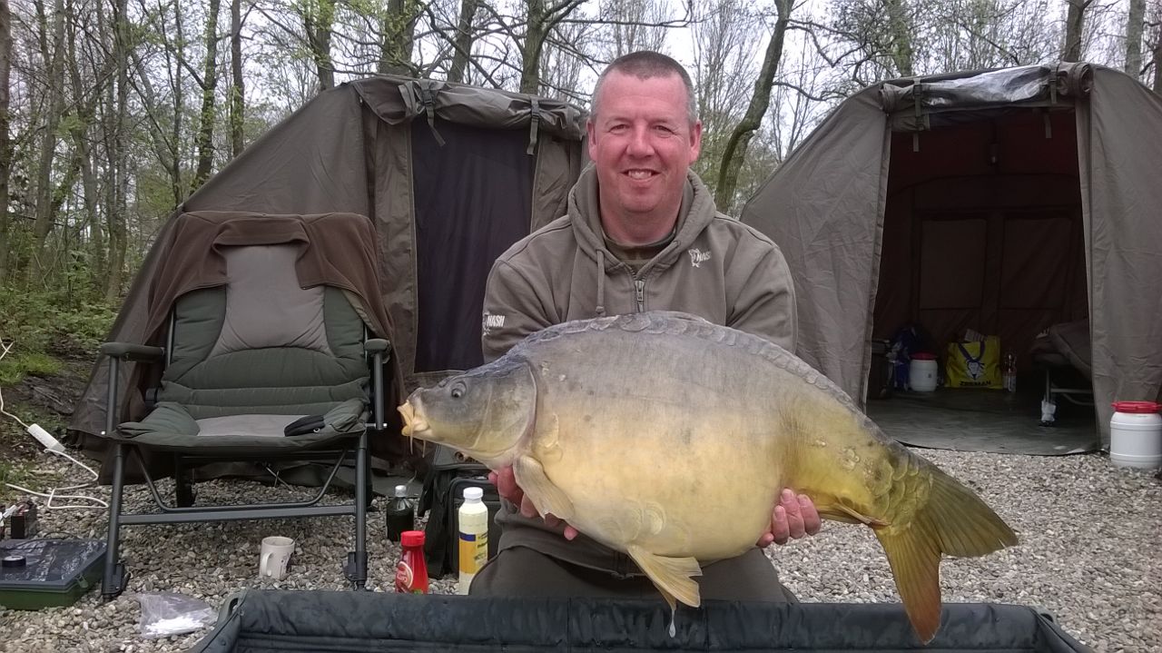 Vrijdag de wissel dag, dat ging snel want mijn tent en brollie stonden er al, één tent en een set hengels wisselen en onze week kon beginnen. De twijfel kwam er wel want na 4 dagen geen vis op de mat begint het wel te kraken in je hoofd. Het weer was zeer wisselvallig, de nachten rond het vriespunt en de wind kwam naar ons gevoel uit de verkeerde hoeken. Op dat moment werd er een enkele vis op de plas gevangen. Toch bleven wij ons vertrouwen houden en die werd beloond met een 30 ponder op dinsdagmorgen. Dat was het begin van de negen vissen die wij in de nog resterende dagen zouden vangen met een mooi gemiddeld van 29,3 pond. Twee stekken waarin wij vertrouwen hadden waren nu al 10 dagen bevist en nog niets opgeleverd en nu beginnen ze te lopen. De eerste 2 runs leverden een losser vanaf deze stek. De rig dusdanig aangepast en nu succes, de stek heeft ons de 40 plussers opgeleverd. Op 5 mei 3 vissen, een 30, 20 en 42 ponder. 6 mei 4 vissen, een 24, 40, 30 en een 20 ponder. Toen de storm, de golven sloegen over het steiger en we keken met schrik naar onze tenten of ze het zouden houden, gelukkig is het goed afgelopen voor ons en de andere vissers. Donderdag nog een oerschub van eigen broed 20 pond, (toch wel mooie vissen) en vrijdagmorgen nog een puntgave spiegel van 38 pond waarmee wij onze sessie moesten afsluiten.