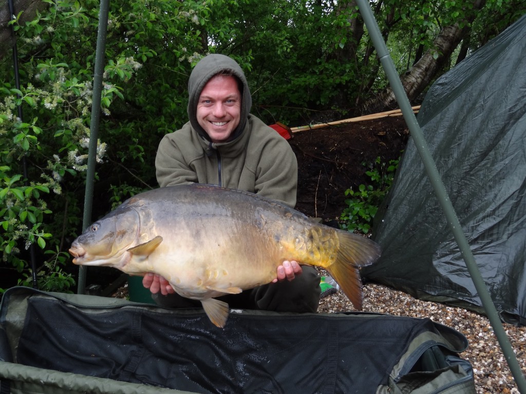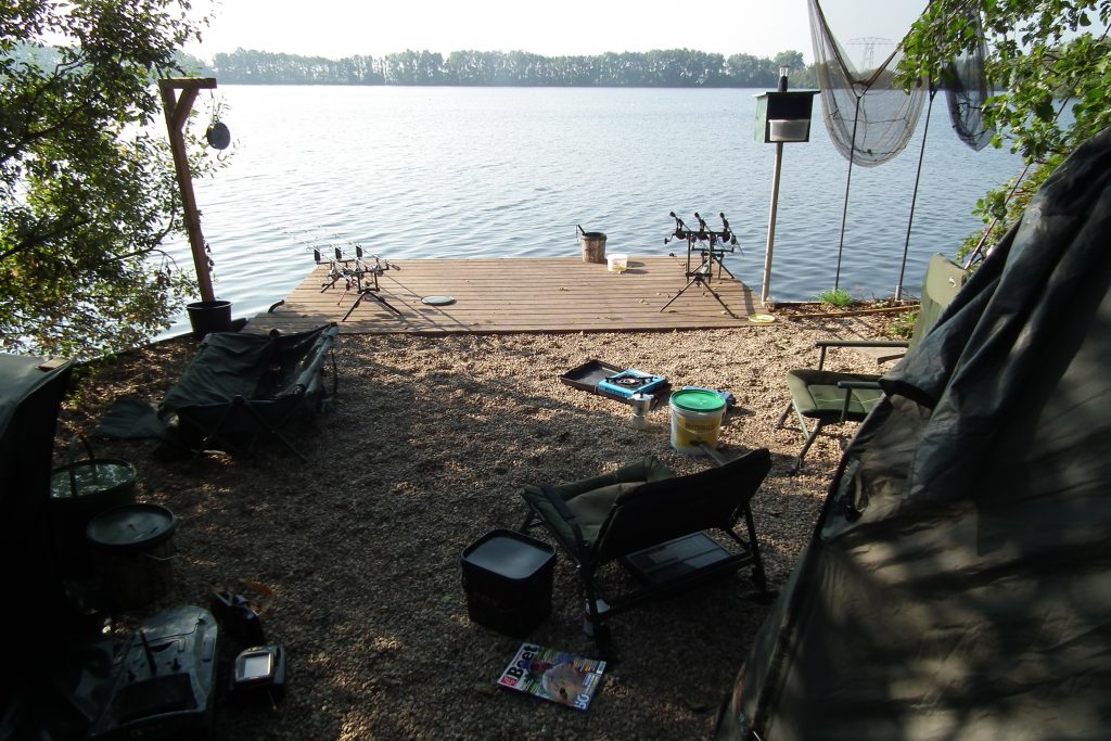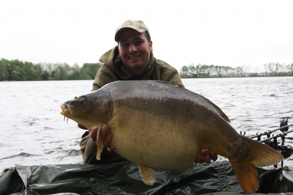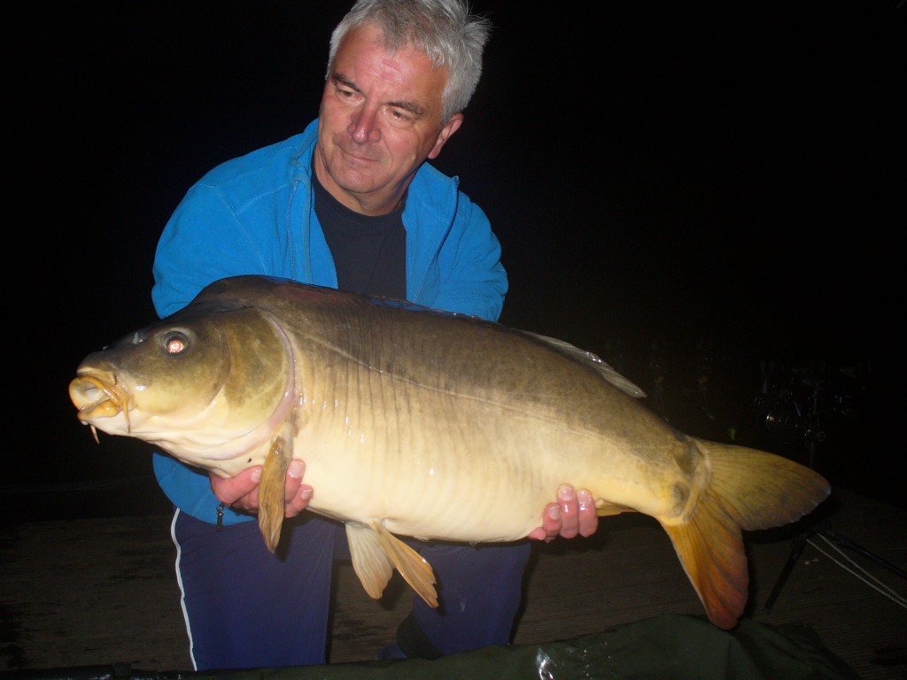 Vrijdag de wissel dag, dat ging snel want mijn tent en brollie stonden er al, één tent en een set hengels wisselen en onze week kon beginnen. De twijfel kwam er wel want na 4 dagen geen vis op de mat begint het wel te kraken in je hoofd. Het weer was zeer wisselvallig, de nachten rond het vriespunt en de wind kwam naar ons gevoel uit de verkeerde hoeken. Op dat moment werd er een enkele vis op de plas gevangen. Toch bleven wij ons vertrouwen houden en die werd beloond met een 30 ponder op dinsdagmorgen. Dat was het begin van de negen vissen die wij in de nog resterende dagen zouden vangen met een mooi gemiddeld van 29,3 pond. Twee stekken waarin wij vertrouwen hadden waren nu al 10 dagen bevist en nog niets opgeleverd en nu beginnen ze te lopen. De eerste 2 runs leverden een losser vanaf deze stek. De rig dusdanig aangepast en nu succes, de stek heeft ons de 40 plussers opgeleverd. Op 5 mei 3 vissen, een 30, 20 en 42 ponder. 6 mei 4 vissen, een 24, 40, 30 en een 20 ponder. Toen de storm, de golven sloegen over het steiger en we keken met schrik naar onze tenten of ze het zouden houden, gelukkig is het goed afgelopen voor ons en de andere vissers. Donderdag nog een oerschub van eigen broed 20 pond, (toch wel mooie vissen) en vrijdagmorgen nog een puntgave spiegel van 38 pond waarmee wij onze sessie moesten afsluiten.